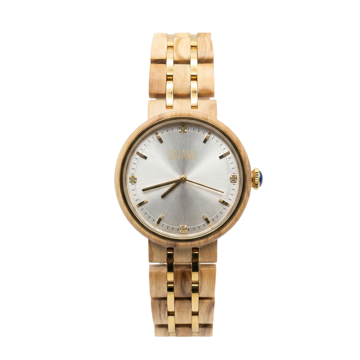 Reloj cronógrafo trabajado a base de madera reciclada, maquinaria quality quartz movement, cristal trabajado en mineral de zafiro y correa de madera.